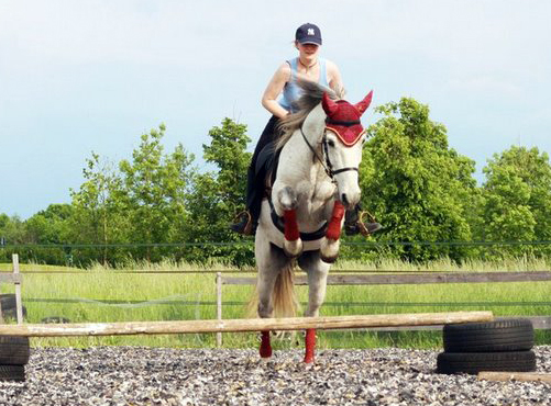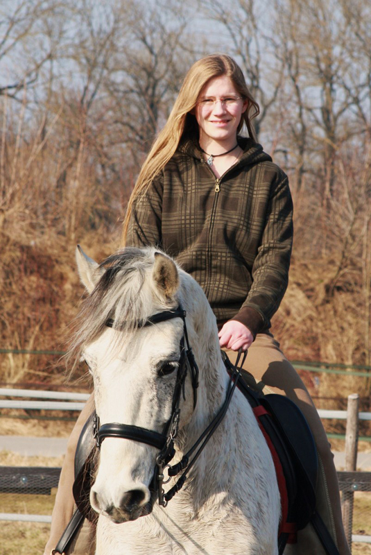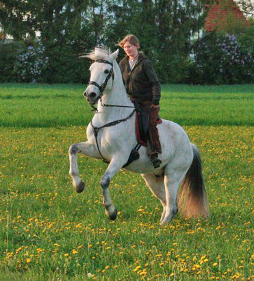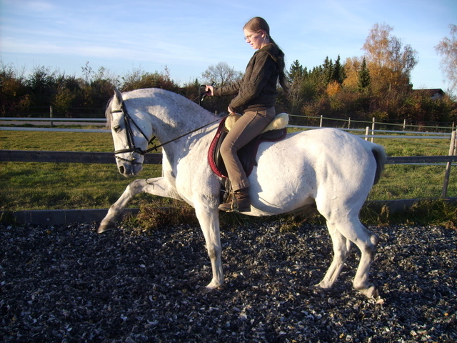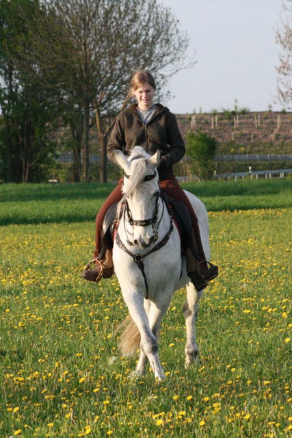 ------------------------------------------------------------------------------------------------------------------ Hallo Alex, jetzt komm ich endlich mal dazu Comódos und meine Geschichte zu schreiben. Ich suchte ein braves zuverlässiges Pferd zum Ausreiten und für die Dressur. Aus gesundheitlichen Gründen war für mich klar, dass es ein Iberer sein sollte, da ich unter anderem auch einen Lusitano habe der aber leider sehr ängstlich ist. In der Nähe fand ich kein passendes oder bezahlbares Pferd. Aus Interesse habe ich auf die Seite barockpino.com geschaut. Ich wusste dass es zum Anschauen zu weit entfernt war. Dann sah ich ihn und laß mir die Beschreibung durch. Hörte sich perfekt an nur eigentlich genau das was ich nie wollte, ein Schimmel. Aber da die Farbe ja zweitranging ist, haben wir einfach mal bei Alex angerufen und noch ein paar zusätzliche Infos bekommen. Dann wurde hin und her überlegt, hinfahren ging nicht - zu weit. Aber ein Pferd ungesehen kaufen? Am Ende haben wir ihn nach Video, aber ungesehen gekauft und er ist das Beste was uns passieren konnte. Er ist ja erst seit September 2010 hier, aber wir haben alle "Unklarheiten" geklärt. Longieren ist gar kein Thema mehr. Auch die gut befahrenen Straßen und die Autobahnen interessieren ihn nicht. Selbst der riesige laufende Mähdrescher ist kein Thema. Beim Arbeiten mit der Säge muss man ihn unbedingt wegsperren sonst hat er seine Nase immer mitten im Geschehen, da er ja überhaupt nicht neugierig ist. Auch die vielen Radfahrer bei uns (die die einem am liebsten die Bügel wegfahren) die er am Anfang nicht so mochte sind kein Thema mehr. Auch Unvorhergesehenes macht ihm nichts aus z.B. einen abgestürzten rosa Luftballon der plötzlich auf dem Weg hinter der Kurve liegt. Da latscht der einfach drüber, die meisten hätten wohl eine Vollbremsung hingelegt. Beim Reiten ist er super zuverlässig und macht viele Fortschritte, er springt übrigens auch super, wobei er immer meint es wäre ein S-Parcours. Sein bester Freund ist eines meiner Ponys geworden der auch nie richtig Anschluss gefunden hat. Sollte ich je wieder ein Pferd suchen würde ich mich wieder an Alex wenden! Vielen Dank für dieses Traumpferd! Ganz Liebe Grüße Magdalena, Comódo mit Familie