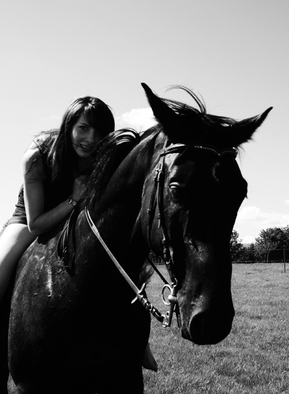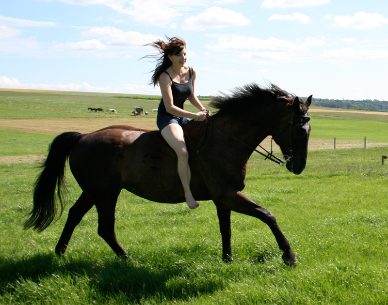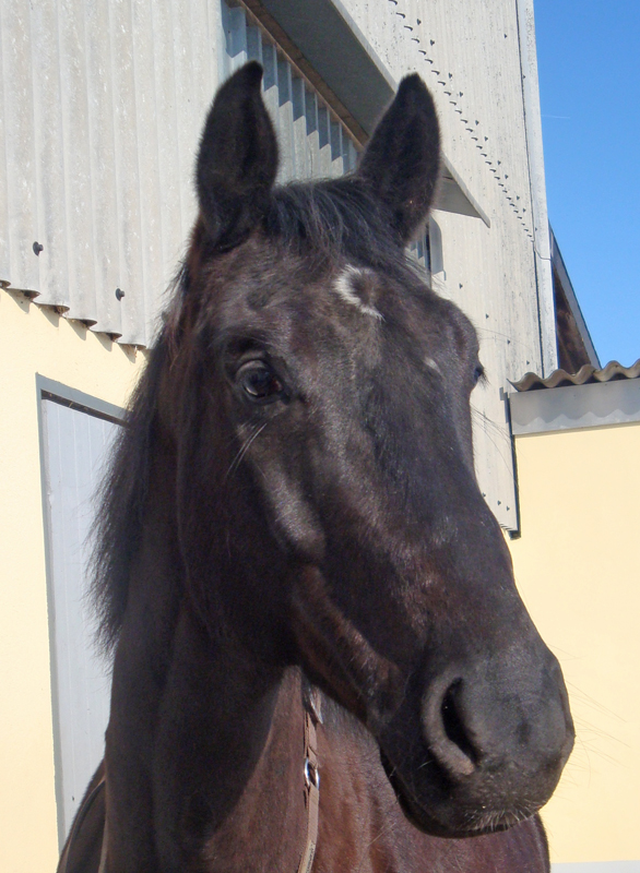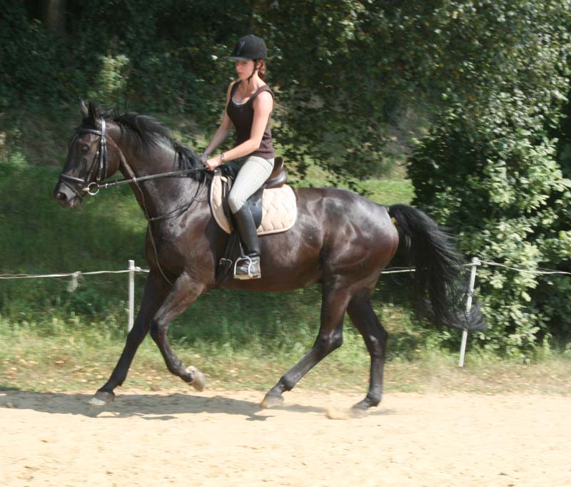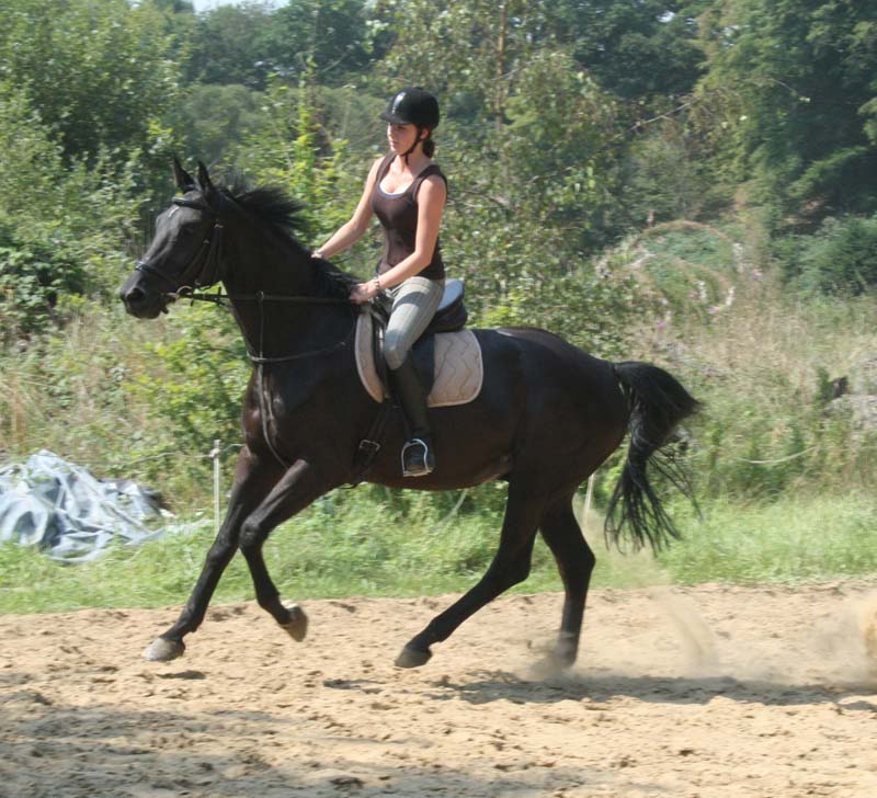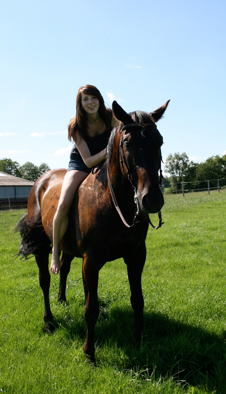 Tami und Leander (Herbst) Als ich im August 2009 auf der Finca Barock-Homepage gelandet bin, war ich mir gar nicht sicher, ob ich wirklich jetzt schon bereit für ein neues Pferdchen war. Denn einen Monat zuvor musste meine geliebte Schimmelstute Lady eingeschläfert werden, da sie auf der Koppel von einem anderen Pferd so schlimm getreten wurde, dass nichts mehr zu retten war. Zu dieser Zeit war ich auf einer 5-wöchigen Reise in Amerika. Ich wusste nicht, wie es zu Hause weiter gehen sollte, wenn ich von Amerika zurück komme, wo man es doch gewohnt war,jeden Tag zu seinem geliebten Schatz zu fahren und sich um diesen zu kümmern. Ich wusste wirklich nicht, was das Beste für mich sein sollte. Da schaute ich mich einfach aus Langeweile und um mich etwas abzulenken auf Barockpinto.com um. Als ich dann die Bilder von Herbst(Ronaldo)-heute Leander ;) sah, wusste ich, dass das eins der Pferde sein würde, die mir helfen konnten, meine Trauer von Lady zu überwinden. Dieser treue Blick und diese sanftmütigen auch neugierigen Augen- sie gaben mir das Gefühl, dass ich mit diesem Pferd glücklich werden sollte. Als ich dann endlich wieder von meinem Urlaub nach Hause kam und ich allem erst mal zwei Wochen Ruhe gab, entschied ich mich dafür, dem Finca Barock-Team einfach mal eine E-mail zu schreiben, einfach um zu wissen, was es denn für ein Pferd war und ob er noch zu verkaufen sei. Damit ich einen Vergleich hatte, wählte ich auch noch 4 andere Pferde(alles Spanier) zum Probieren aus. Im Hintergedanken wusste ich aber eigentlich schon, dass es dieser schwarze Wallach sein würde, wenn ich denn doch tatsächlich mit ihm zurecht kommen würde. Meine Mutter meinte, es wäre doch etwas voreilig, jetzt schon nach einem neuen Pferd zu suchen, aber ich hoffte zu wissen, was für mich das Beste sein würde. Also vereinbarten wir einen Termin zum Probereiten. Das erste mal, als wir nach Montabaur fuhren, war Leander leider auf einem Tagesritt und ich konnte ihn erstmal nicht Probereiten L Dafür probierte ich 2 Spanier, die ich eigentlich auch ganz angenehm fand, aber es war einfach nicht das, wonach ich suchte. Eine Woche später fuhren wir noch mal nach Montabaur und diesmal konnte ich auch den „kleinen“ Wallach Probe reiten. Auch wenn er nicht ganz so sensibel und angenehm zu reiten war, wie die Spanier wusste ich: DAS ist das Pferd, was mir helfen wird, meine Trauer von Lady zu überwinden. Ich wusste auch, dass da noch viel Arbeite reingesteckt werden musste, da er ja auch erst 6 war, aber ich war bereit dafür. Damit ich dieses mal keinen Fehler machen wollte, wie bei meinem ersten Pferd, legte ich einen Termin für die Ankaufsuntersuchung in der Klinik Burg Müggenhausen fest. Dort angekommen führte sich der Wallach wie ein Hengst auf und ich war überrascht, was alles in dem „Kleinen“ drin steckte ;) Als der Tierarzt dann die Beugeprobe machen wollte, Leander aber so genervt von den Fliegen war, hüpfte er auf 3 Beinen hin und her und sprang mir erst mal auf den Fuß! Ich hatte natürlich nur Turnschuhe an und eine Helferin musste mir erst mal einen Kühlaukku besorgen :P Ich nahm das gelassen und sagte:“ Das ist doch ein guter Anfang!“ Nach 2 Stunden hatten wir alles gut überstanden und wir traten die Heimreise an. Im neuen Stall angekommen, bekam Leander erst mal was Gutes zu futtern und auch wenn er erst mal alleine im Stall stand, da die anderen auf der Koppel waren, benahm er sich sehr ruhig und unauffällig. Auf diesem Hof stehen die Pferde in Gruppen auf Paddocks/ Koppel und erst mal mussten wir die Pferde aneinander gewöhnen, was aber auch reibungslos verlief. Natürlich musste Leander auch mal zeigen, was in ihm steckte und versuchte einen höheren Rang zu erreichen, was nicht immer so ganz funktionierte und was man später an ein paar kleinen Bissspuren sehen konnte. Naja, wer viel austeilt, muss auch mal was einstecken ;) Als ich dann das erste Mal mit ihm in der Halle war, hatte dieses Pferdchen soviel Power, dass ich erst mal absteigen musste und ihn laufen gelassen hab. Da hat er sich dann mal richtig ausgetobt und gezeigt, wie hoch er buckeln kann. Ich arbeite jetzt täglich mit ihm, denn so ein Powerpaket kann man nicht grad einfach mal einen Tag so stehen lassen :P Anfangs habe ich sehr viel Vorwärts- abwärts mit ihm gearbeitet, damit er erst einmal Rückenmuskulatur aufbaut und jetzt hat er wirklich schon große Fortschritte gemacht. Er ist sehr viel weicher im Maul geworden und arbeitet auch meistens schön mit. Manchmal diskutiert er aber auch mal gerne und versucht seinen Kopf durch zusetzen :P Mit Hilfe einer guten Lehrerin(guten Bekannten) macht es mir jeden Tag aufs neue Spaß mit dem „Kleinen“ zu arbeiten, auch wenn er mir des Öfteren schon die Nerven geraubt hat ;) Mit Bodenarbeit haben wir auch schon begonnen und ich versuche ihm sogar den Spanischen Schritt beizubringen, wo er wirklich schon versucht sein Bestes zu geben- ich weis, auch wenn es kein Spanier ist- sogar einem Oldenburger Pferdchen kann man so was beibringen- zumindest kann man es versuchen J Ich muss auch sagen, dass er mir auch vieles beibringt, da ich nie zuvor mit einem jungen Pferd gearbeitet habe und so neue Erfahrungen sammele. Im Gelände ist er ein sehr braves und zuverlässiges Pferd, auch wenn er einem mal zeigen möchte, wie schnell er doch sein kann. Vielleicht werden wir es dieses Jahr mal mit ein paar kleineren Turnieren in der E-Liga versuchen- ich weis ja, dass in ihm noch mehr drin steckt, aber erst mal schön langsam anfangen J Aber ich bin froh, dass ich damals die richtige Entscheidung getroffen habe, und spüre, dass es mir sehr geholfen hat! Ich liebe dieses Pferd, genau wie mein erstes und freue mich auf jeden neuen Tag, den ich mit meinem Kleinen aufs Neue genießen kann. Vielen Dank noch mal Alex, für den netten Kontakt und dass du mir geholfen hast, das „Passende“ zu finden J Ganz liebe Grüße Tami