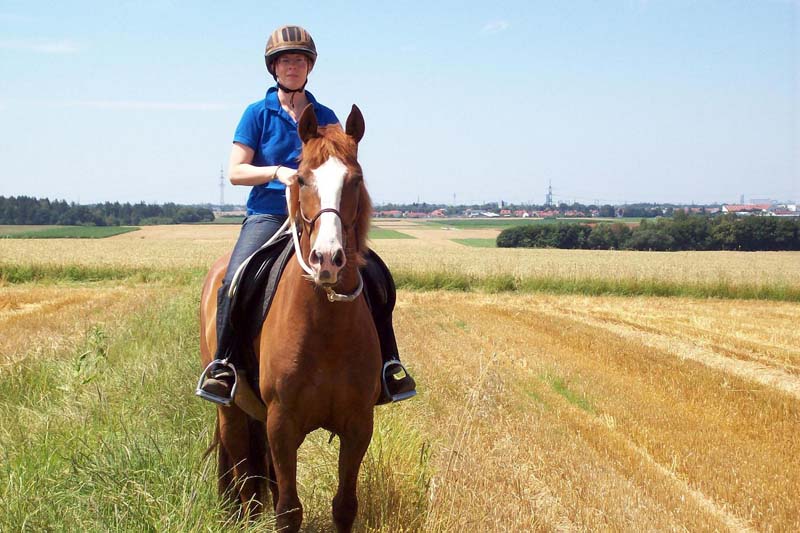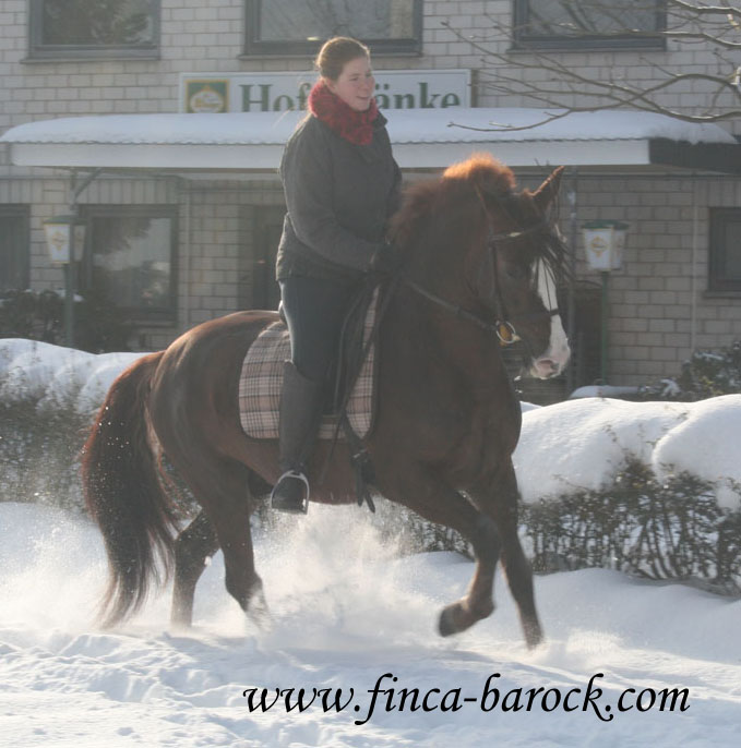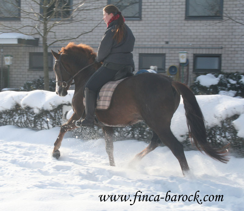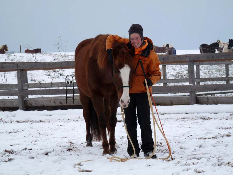 Sandra und Temprano Liebe Alex, es ist tatsächlich schon über 2 Jahre her, dass ich zwecks Pferdebesichtigung die Strecke München - auf mich genommen habe. Und ich kann bis heute sagen, die Reise hat sich gelohnt! Nach vielen (nächtlichen) Stunden bei pferdemarkt.de und ehorses.dehatte ich doch glatt 3 Pferde gefunden, die ich interessant fand. Und am besten gefiel mir Temprano. Als ich - in Montabaur angekommen - die Box betreten habe, müssen meine Augen geleuchtet haben. Meine liebe Freundin Sigi, die mich begleitet hatte, wusste schon in diesem Moment, dass Temprano gekauft werden wird... Bis ich selbst es auch wusste, hat es noch 4 Stunden gedauert! An dieser Stelle nochmal danke, dass du dir geduldig so viel Zeit genommen hast! War ein großer Schritt für mich, nach 10 Jahren des Träumens (und natürlich langjähriger Reitbeteiligungen) nun also mein erstes eigenes Pferd zu kaufen. Seit dem 24. Januar 2011 haben Temprano und ich schon einiges erlebt und wir sind gut zusammen gewachsen. U.a. waren wir im Sommer 2011 in Bückeburg an der Hofreitschule, um uns die Kunst der Handarbeit zeigen zu lassen; Im Herbst 2011 haben wir mein ehemaliges Reitbeteiligungspferd besucht und sind dort gemeinsam ausgeritten; im Frühjahr 2012 haben wir an einem Parelli Kurs teilgenommen; seit Sommer 2012 nehmen wir regelmäßig an den Legerte Kursen teil, die glücklicherweise direkt bei uns am Hof organisiert werden. Im Herbst 2012 hat Temprano eine passende Reitbeteiligung gefunden. Die Fotos, die ich angehängt habe, können vielleicht einen kleinen Eindruck unserer Aktivitäten vermitteln. Ich habe bei dir genau das richtige Pferd für mich gefunden. Deine Website besuche ich aus Interesse und Neugier immer noch regelmäßig. Wie ich sehe, gibt es immer wieder ehemalige Kunden, die sich von ihrem Pferd trennen müssen, und es dann dir anvertrauen, um einen neuen Besitzer zu finden. Das halte ich für ein sehr schönes Kompliment an dich! In diesem Sinne - liebe Grüße aus Bayern, Sandra mit "Tempi"